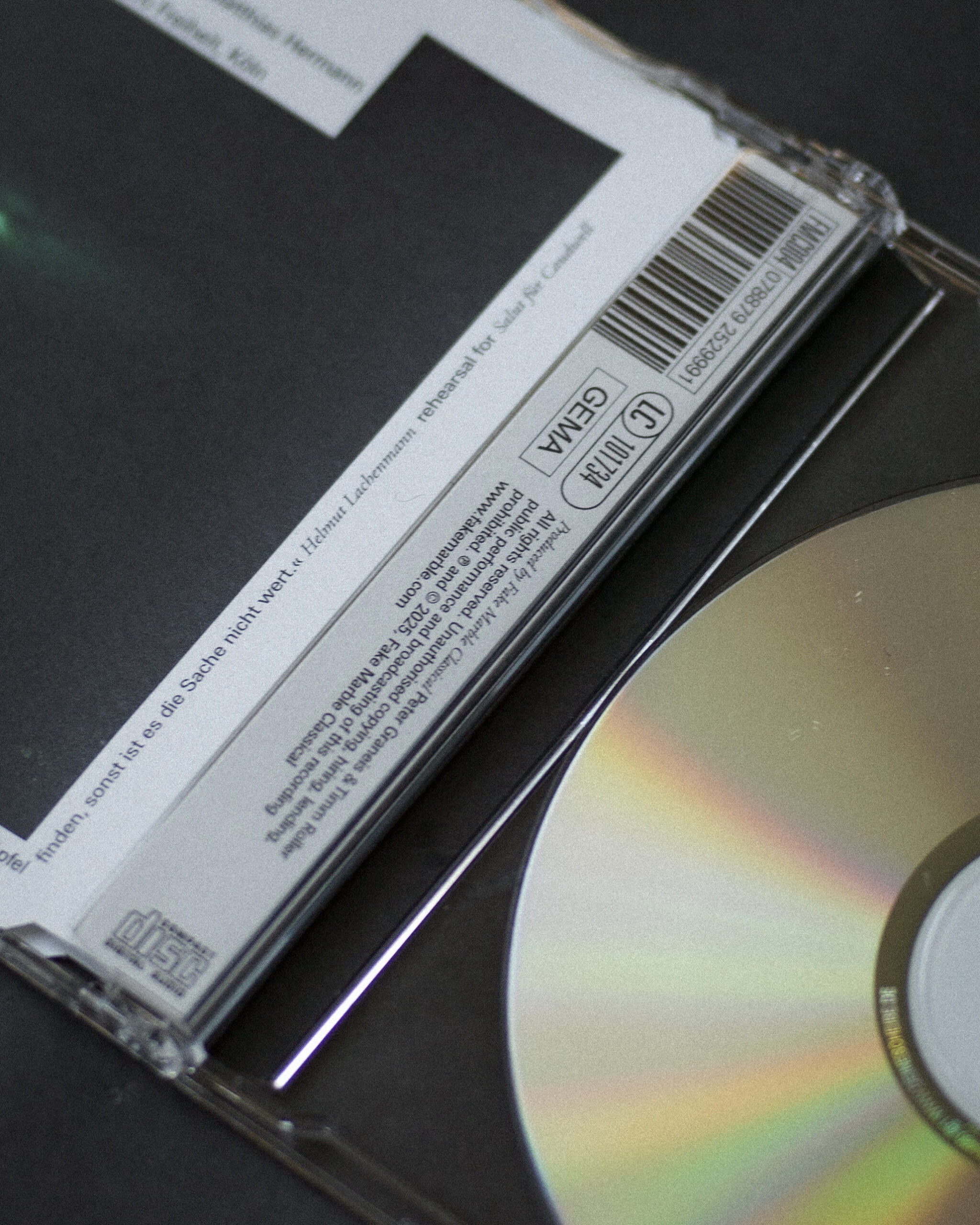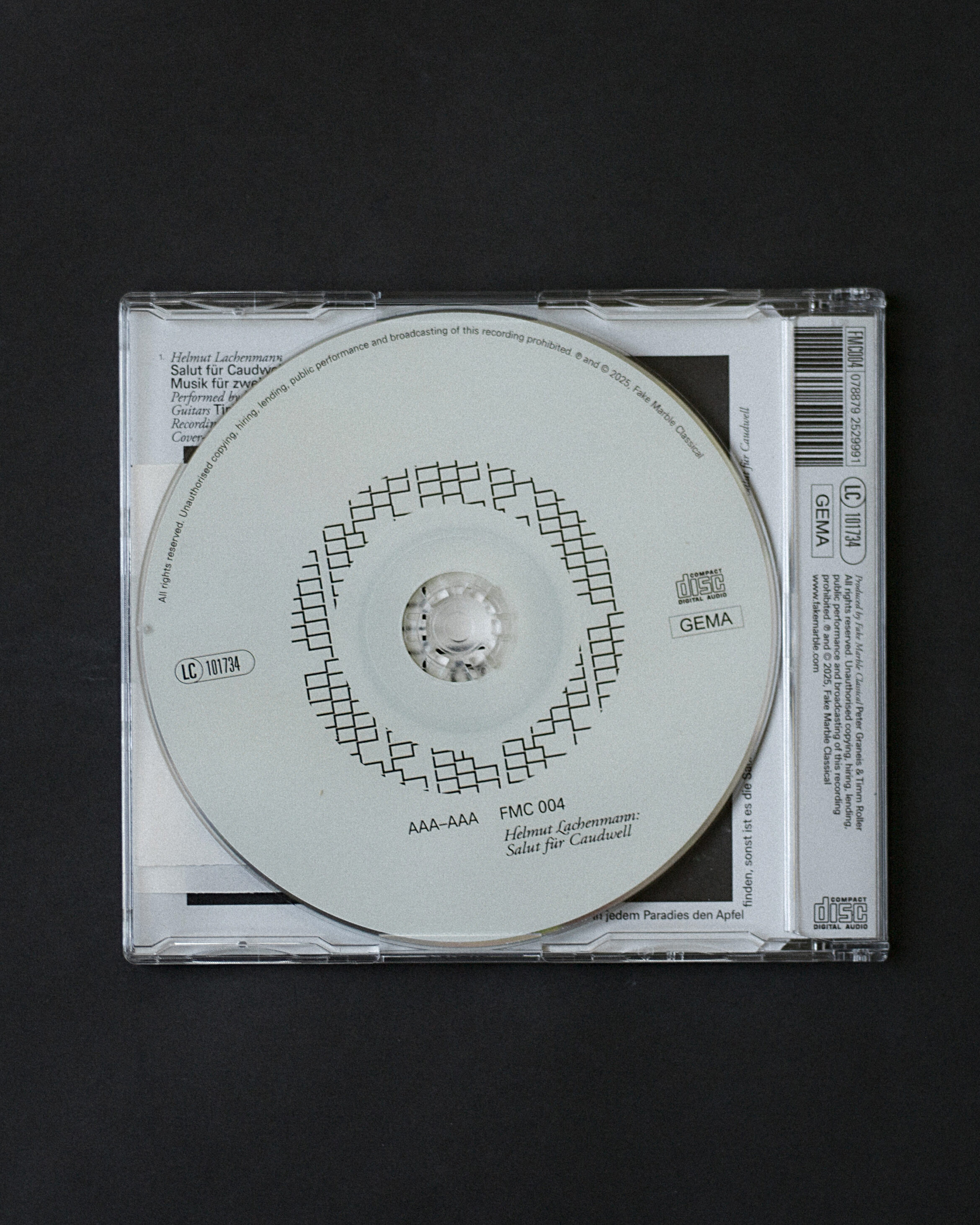 Maxi CD for Fake Marbel Classical for the release of »AAA-AAA« — Salut für Caudwell. Edition of 90 copies for Helmut Lachenmann’s 90th birthday. »One must live dangerously — to find the apple in every paradise, otherwise it’s not worth the effort.«Helmut Lachenmann in a rehearsal for Salut für Caudwell @fake.marble Artistic Consulting: Matthias HermannRecording: Igor StepanovMastering: Timm RollerCover Photography: Timm RollerGraphic Design: Daniel Angermann, Büro Freiheit, Cologne Produced by Fake Marble Classical: Peter Graneis & Timm Roller