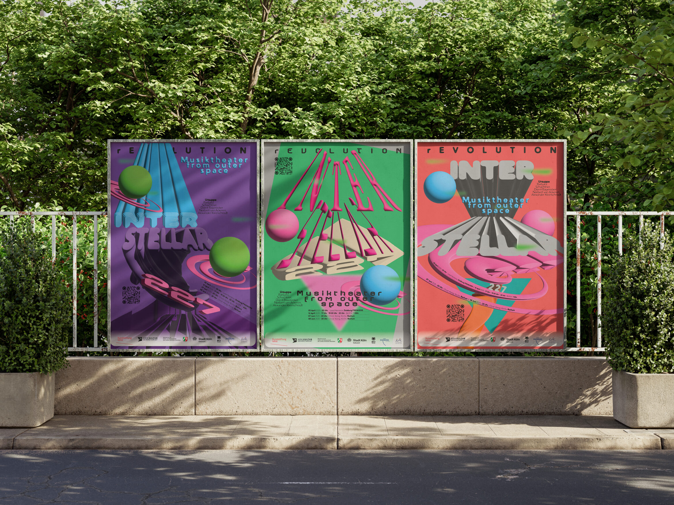 Poster series for the concert performance »rEVOLUTION« by INTERSTELLAR 227 »INTERSTELLAR 2 2 7 shows collective development processes in art and nature, with voice and electronics, on keys and strings, scenographically condensed and reviewed live.«
