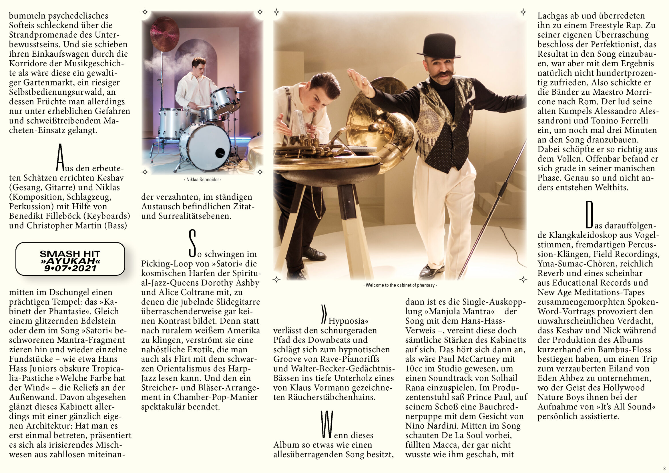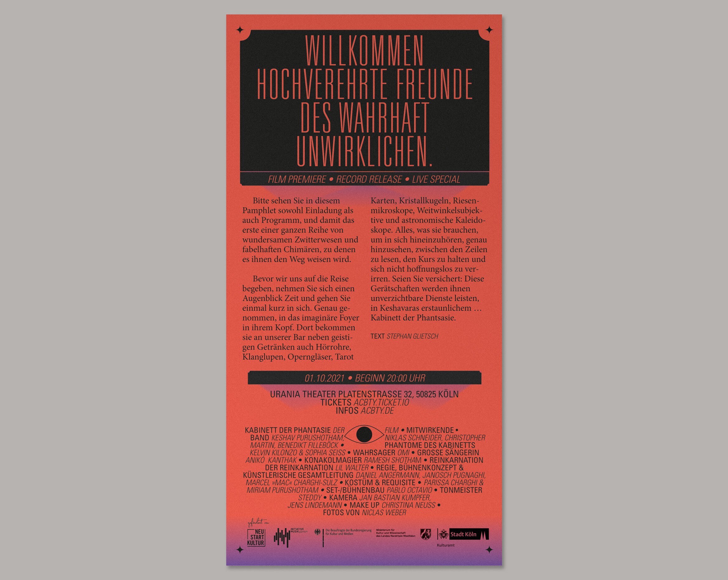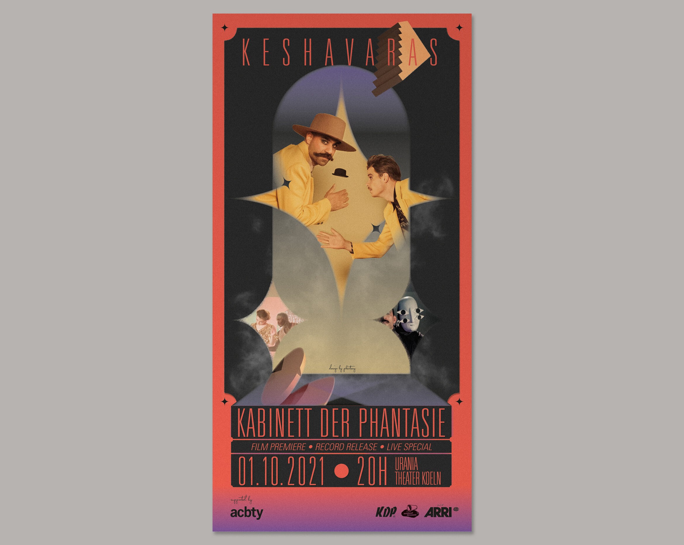 Für das neue Album von »KESHAVARA« und den damit erscheinenden Musikfilm des bekannten Musiktheaters »Kabinett der Phantasie« waren wir gemeinsam mit Marcel Sulz (Die Ottos) für Konzeption, Regie, Bühnenkonzept sowie die künstlerische Gesamtleitung des Film-Projekts verantwortlich. Das Kabinett der Phantasie öffnet seine Türen und entführt das Publikum an fabelhafte Orte. Indische Masken, Göttergeschichten und magische Instrumente gehören ebenso zur Aufführung wie tänzerische Anlehnungen an Shakespeares Othello. KESHAVARA verwebt Musik, Schauspiel und Tanz zu einem avantgardistischen Theater. Das Ensemble »KESHAVARA« war seither bei zahlreichen Auftritten, u.a. c/o Pop (Köln), Philharmonie Essen (Präsentiert von WDR Cosmo Radio), Staatstheater (Darmstadt), Altes Pfandhaus (Köln) zu sehen und wird am 24.7. im HKW Berlin zu sehen sein. Künstler KESHAVARA Albumtitel Kabinett der Phantasie Releasedatum 01.10.2021 Label Papercup Records Vertrieb Rough Trade Distribution Komposition & Produktion KESHAVARA Mix KESHAVARA & Steddy Master Steddy Fotos Niclas Weber Text Stephan Glietsch Mitwirkende Phantome des Kabinetts Kelvin Kilonzo & Sophia Seiss Wahrsager Omid Tabari Große Sängerin Anik Kanthak Konakolmagier Ramesh Shotham Reinkarnation der Reinkarnation Lil Walter Regie, Bühnenkonzept & künstlerische Gesamtleitung Daniel Angermann, Janosch Pugnaghi Marcel „Mac” Charghi-Sulz Kostüm & Requisite Parissa Charghi & Miriam Purushotham Tonmeister Steddy Kamera Jan Bastian Kumpfer, Jens Lindemann Kamera Assistenz Niklas Horn Bühne Pablo Octavio Make up Christina Neuss Fotos von © Niclas Weber