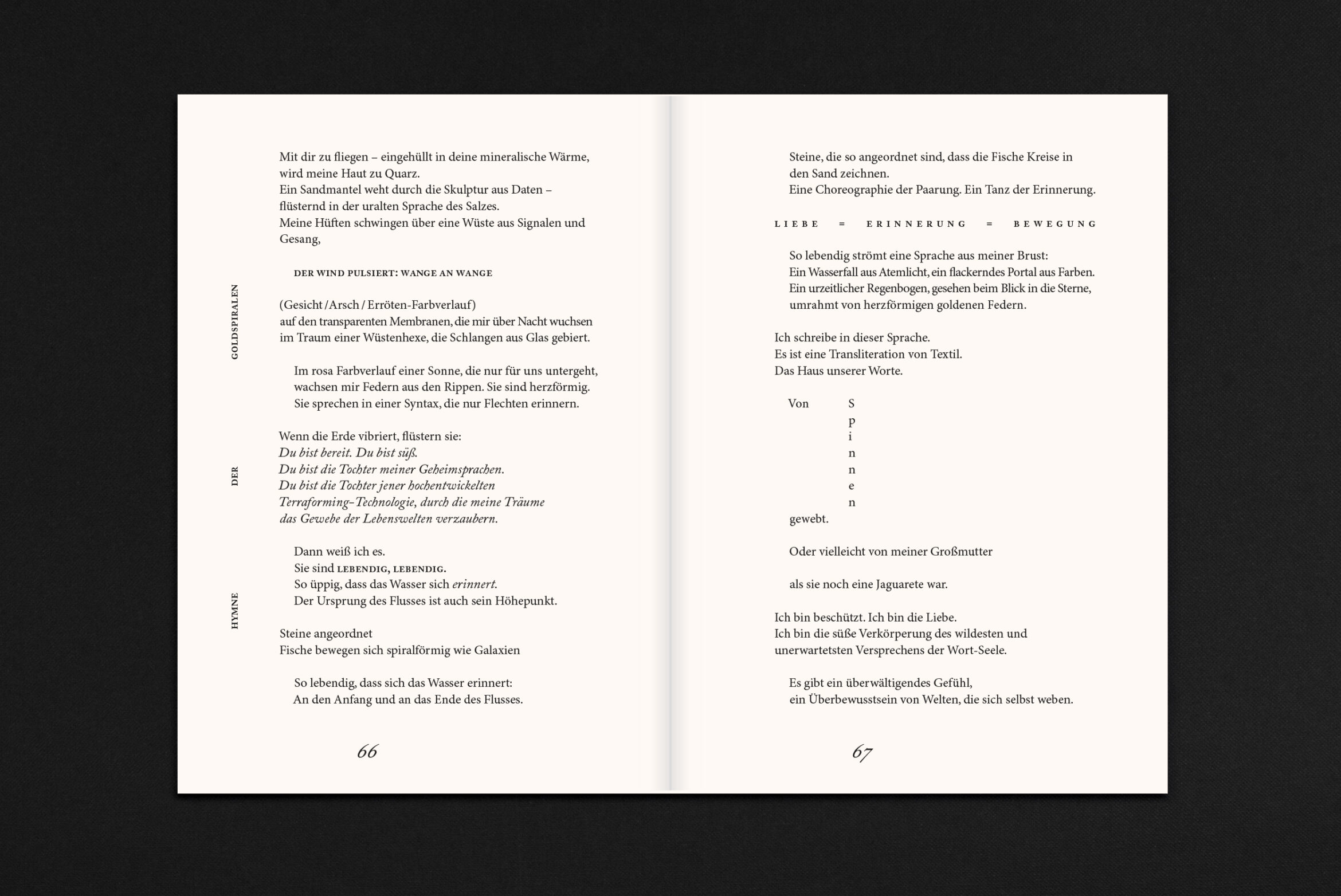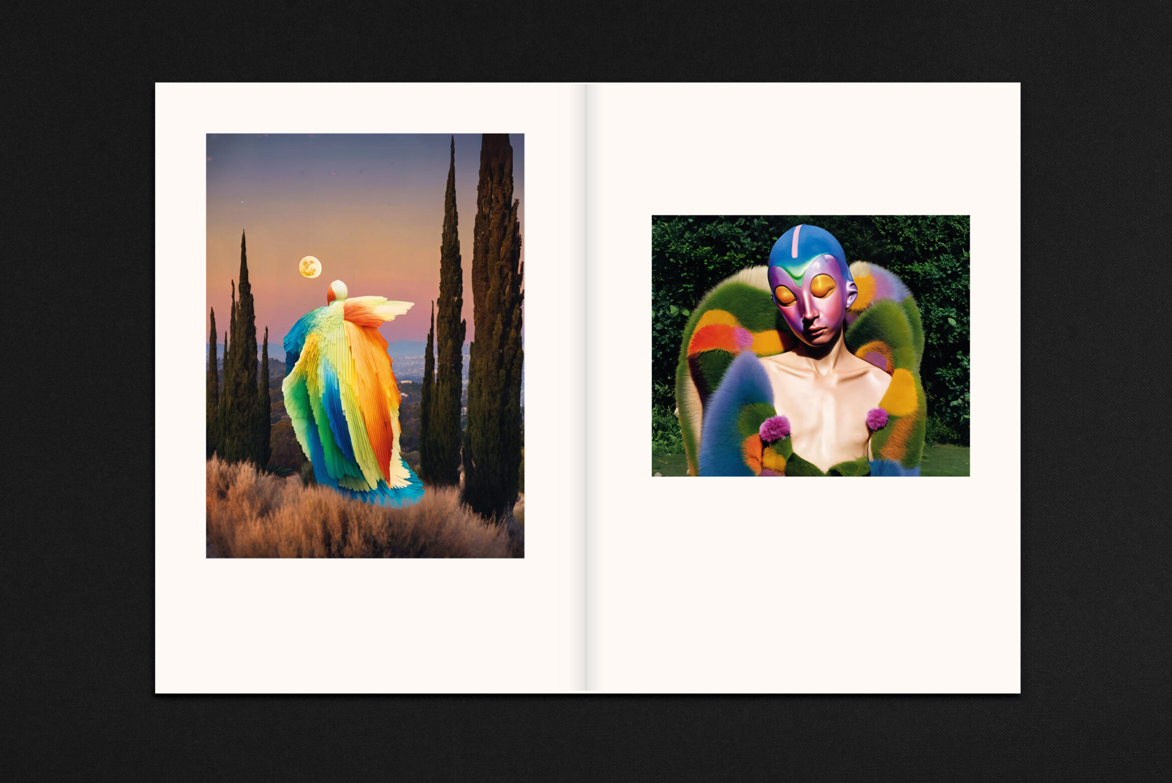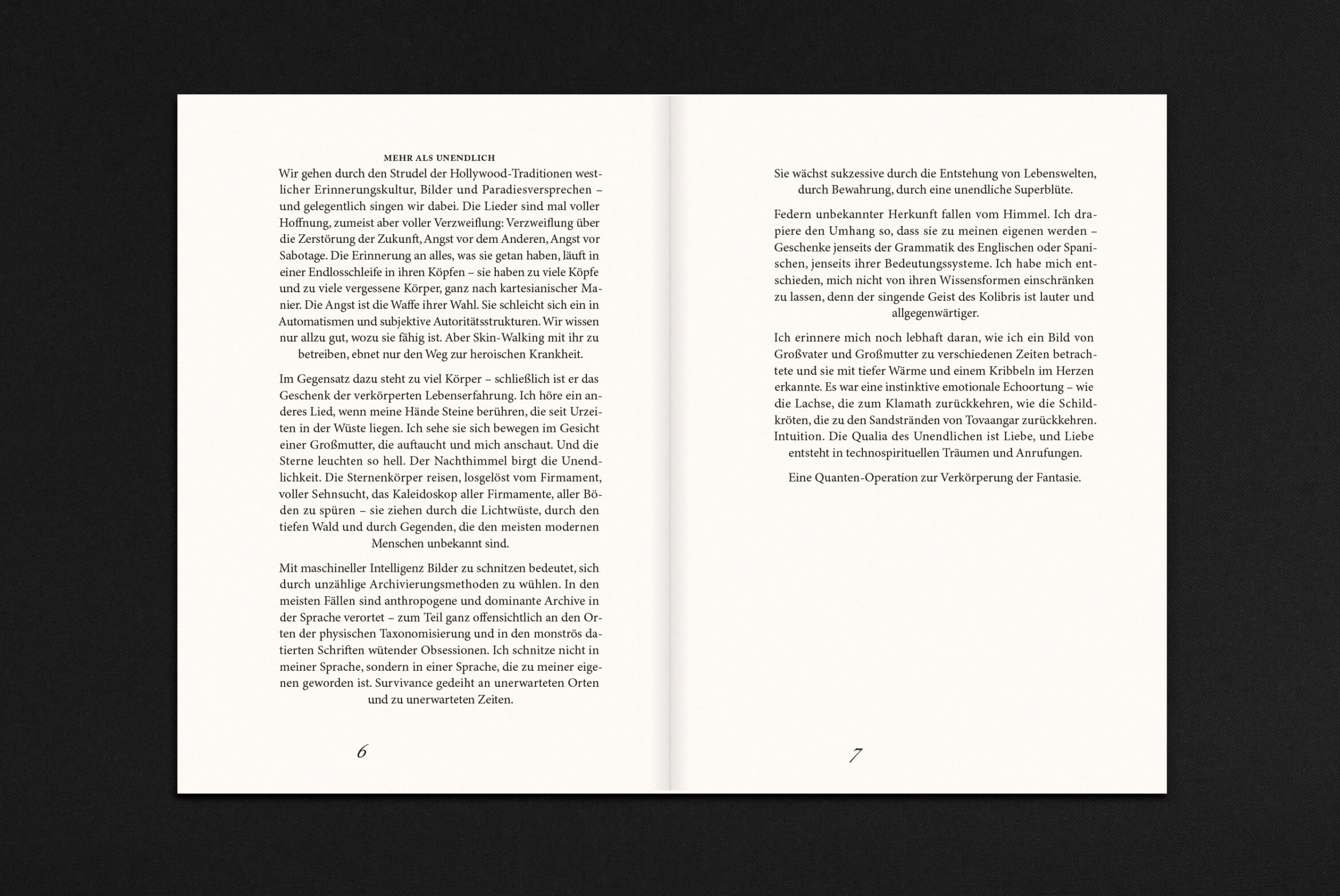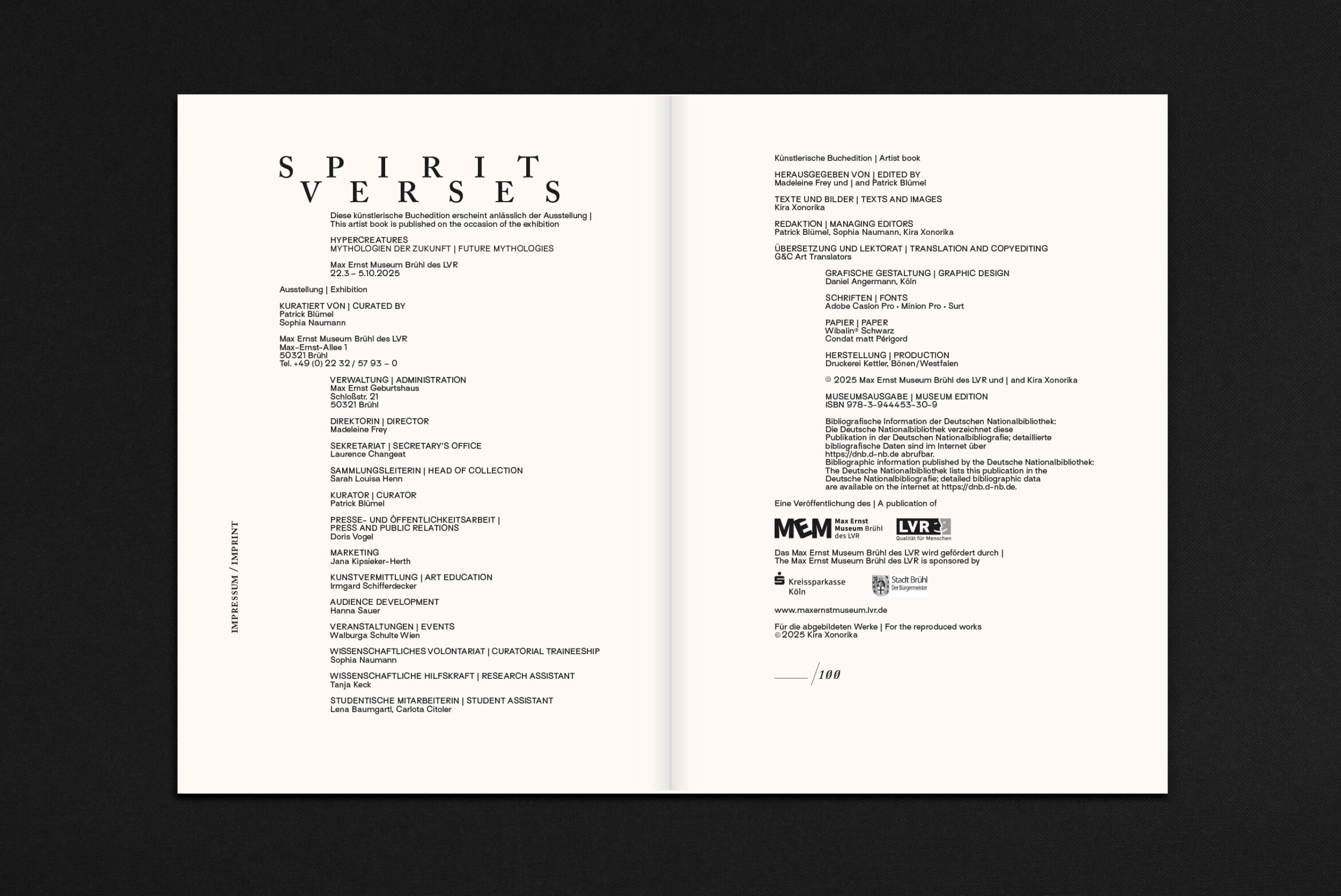 In the resonance space of the exhibition »Hyper Creatures«, a publication in edition form was created in conceptual collaboration with curators Patrick Blümel, Sophia Naumann, and the artist Kira Xonorika: »Spirit Verses« – a multi-layered, surreal artistic work of image and text, unfolding over 74 pages. »Through poetry, surrealist literature, speculation and autoethnography, it weaves together personal stories and ideas in dialogue with the current exhibition Hypercreatures: Future Mythologies. This bilingual limited edition is available in English and German at the Max Ernst Museum. The book features images produced through generative AI trained on my datasets, alongside collage and digital painting.«Kira Xonorika The verses move between calm, classical paragraphs and playful displacements – always harmonious, structured by a French page layout and a clear baseline grid. Kira’s images and texts are presented in a Swiss brochure with hardcover: the back title shimmers in foil stamping, while the front cover features a lenticular image embedded in the board. On the occasion of the 20th anniversary, the book is available from today, 04.09.2025, at the Max Ernst Museum of the LVR in Brühl