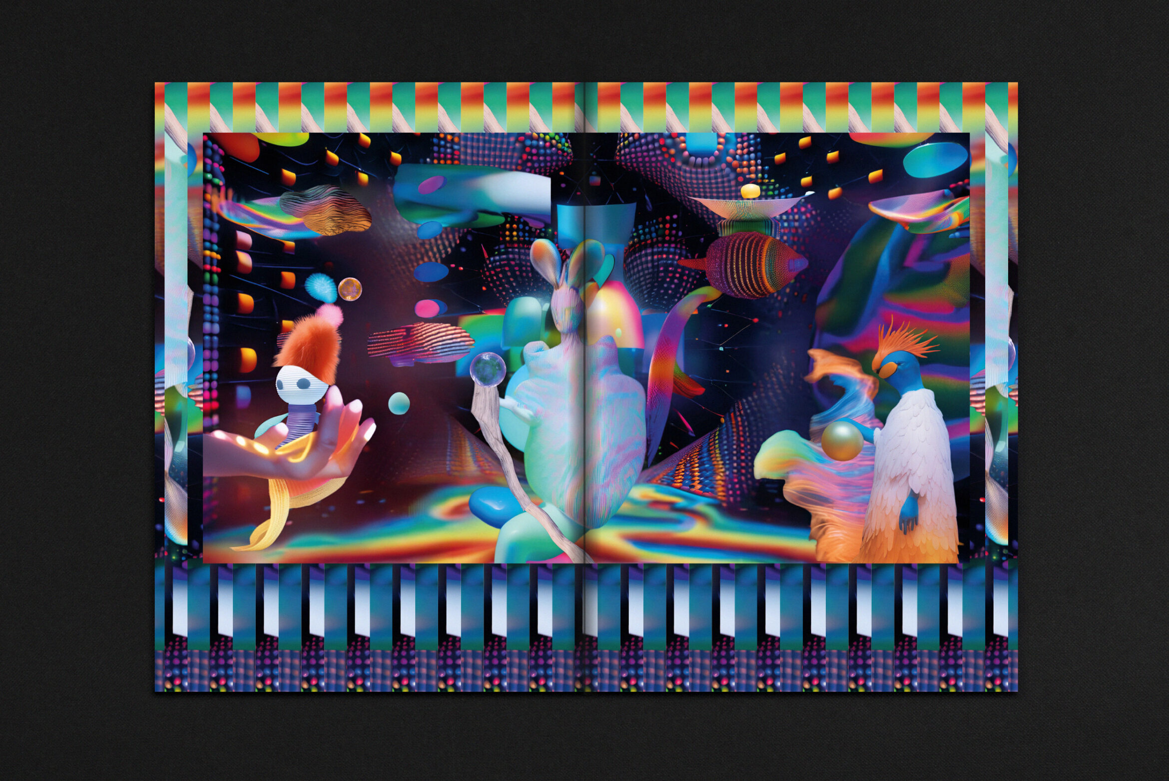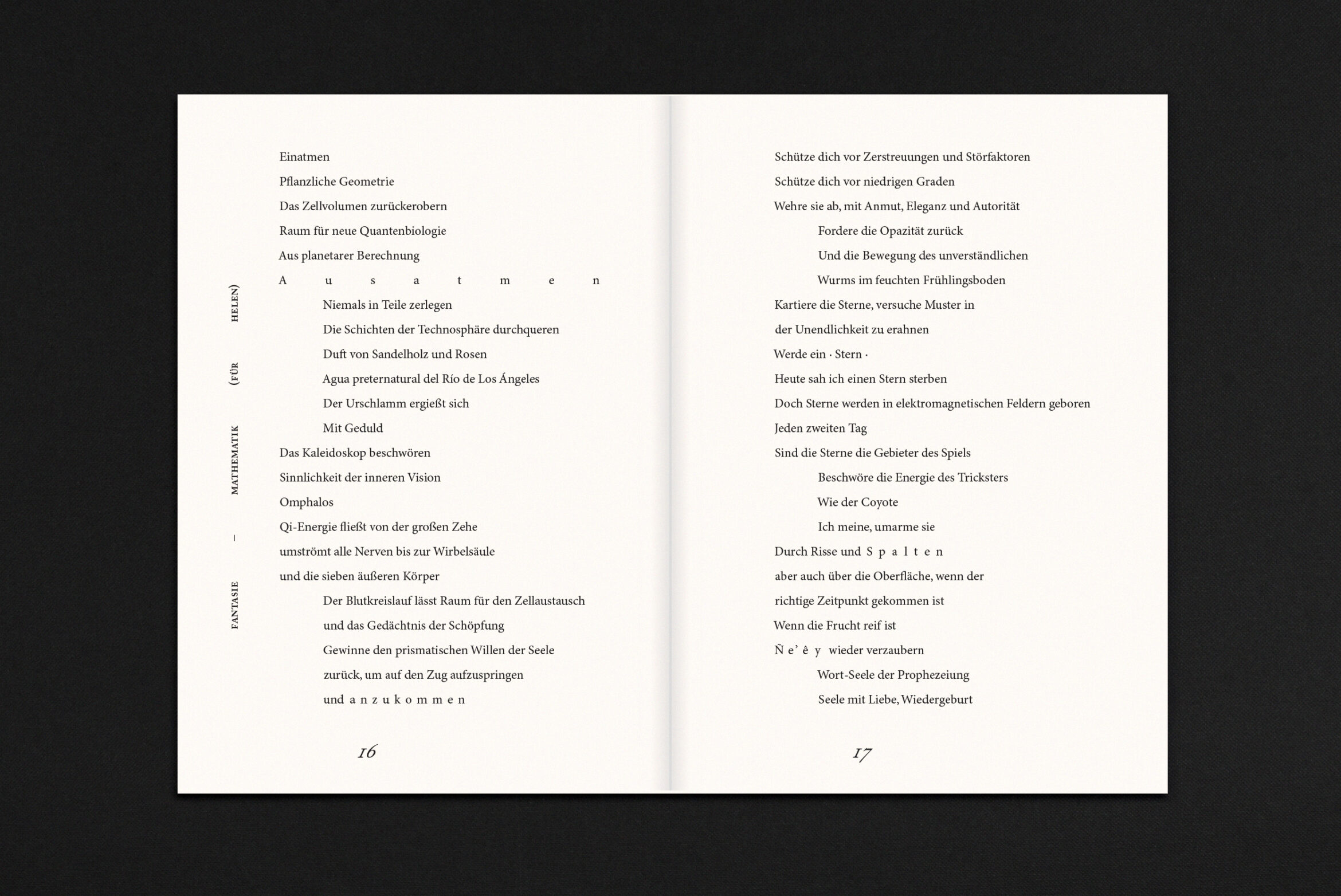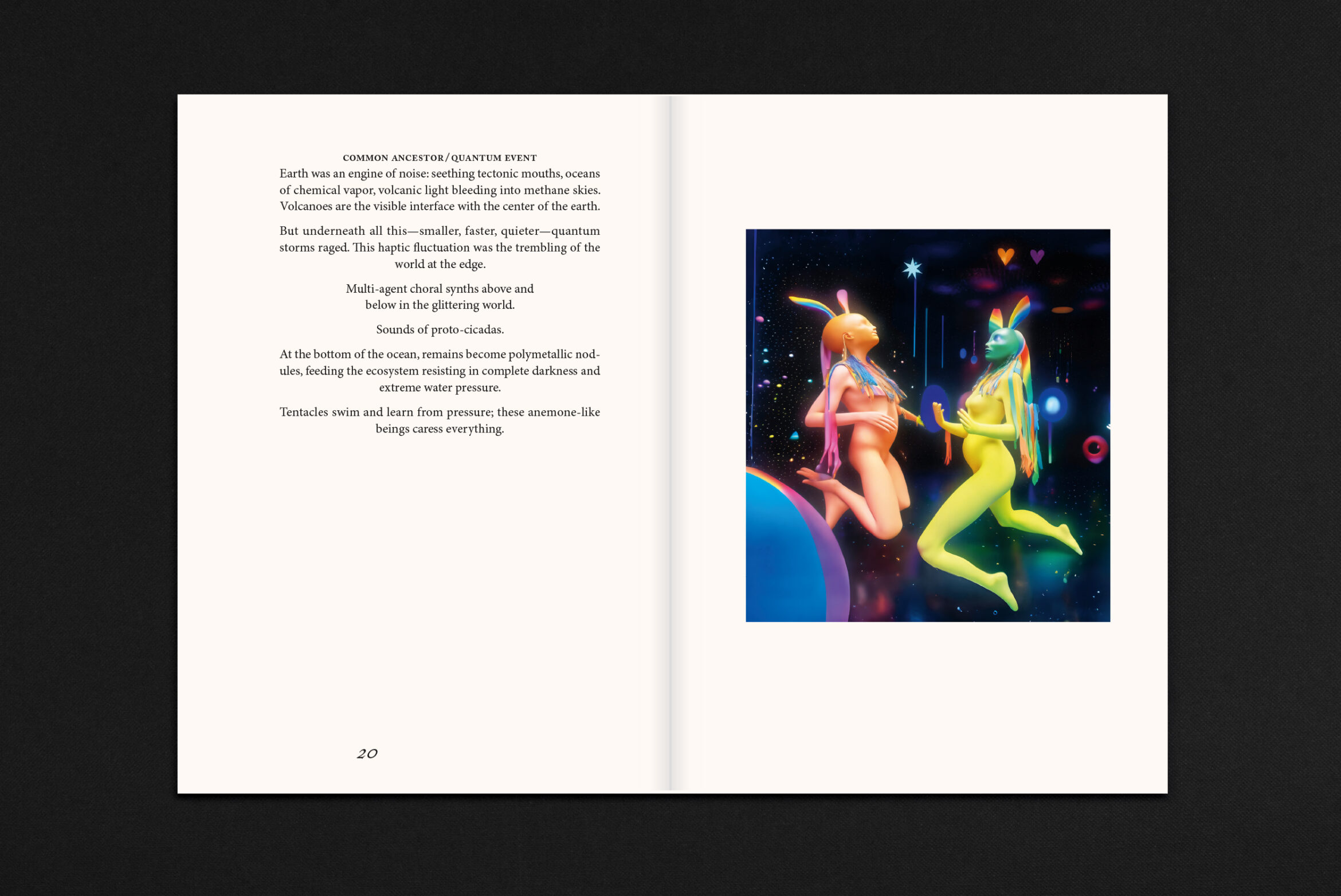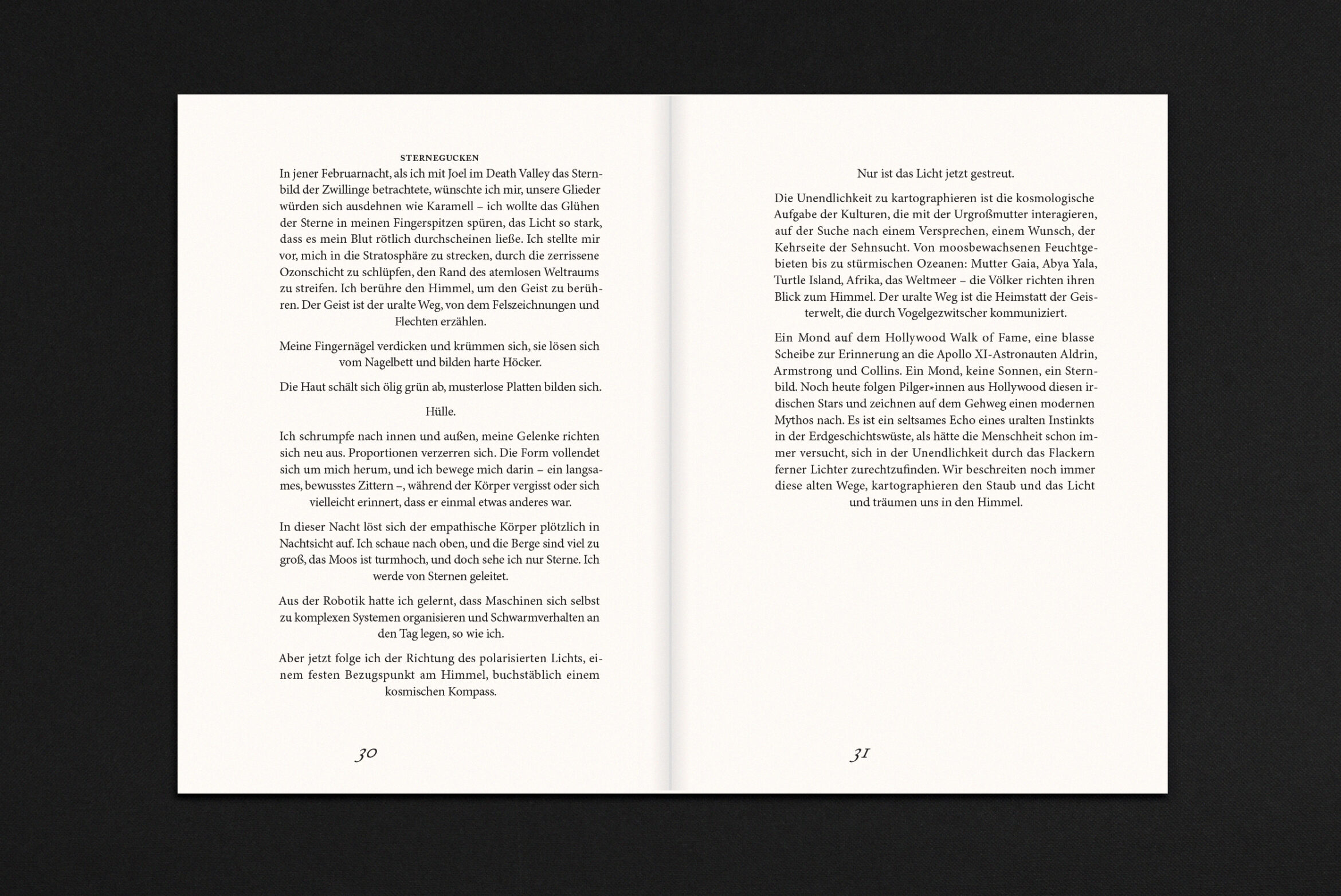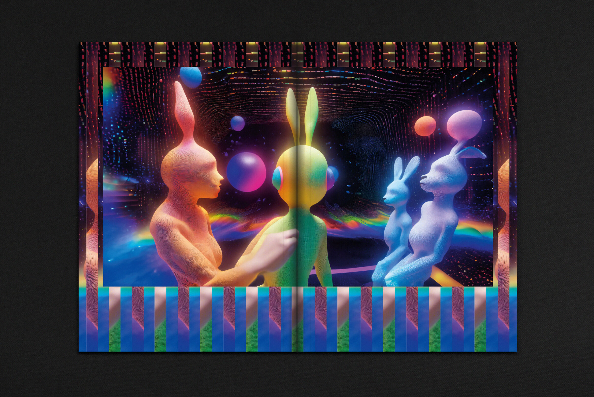 In the resonance space of the exhibition »Hyper Creatures«, a publication in edition form was created in conceptual collaboration with curators Patrick Blümel, Sophia Naumann, and the artist Kira Xonorika: »Spirit Verses« – a multi-layered, surreal artistic work of image and text, unfolding over 74 pages. »Through poetry, surrealist literature, speculation and autoethnography, it weaves together personal stories and ideas in dialogue with the current exhibition Hypercreatures: Future Mythologies. This bilingual limited edition is available in English and German at the Max Ernst Museum. The book features images produced through generative AI trained on my datasets, alongside collage and digital painting.«Kira Xonorika The verses move between calm, classical paragraphs and playful displacements – always harmonious, structured by a French page layout and a clear baseline grid. Kira’s images and texts are presented in a Swiss brochure with hardcover: the back title shimmers in foil stamping, while the front cover features a lenticular image embedded in the board. On the occasion of the 20th anniversary, the book is available from today, 04.09.2025, at the Max Ernst Museum of the LVR in Brühl