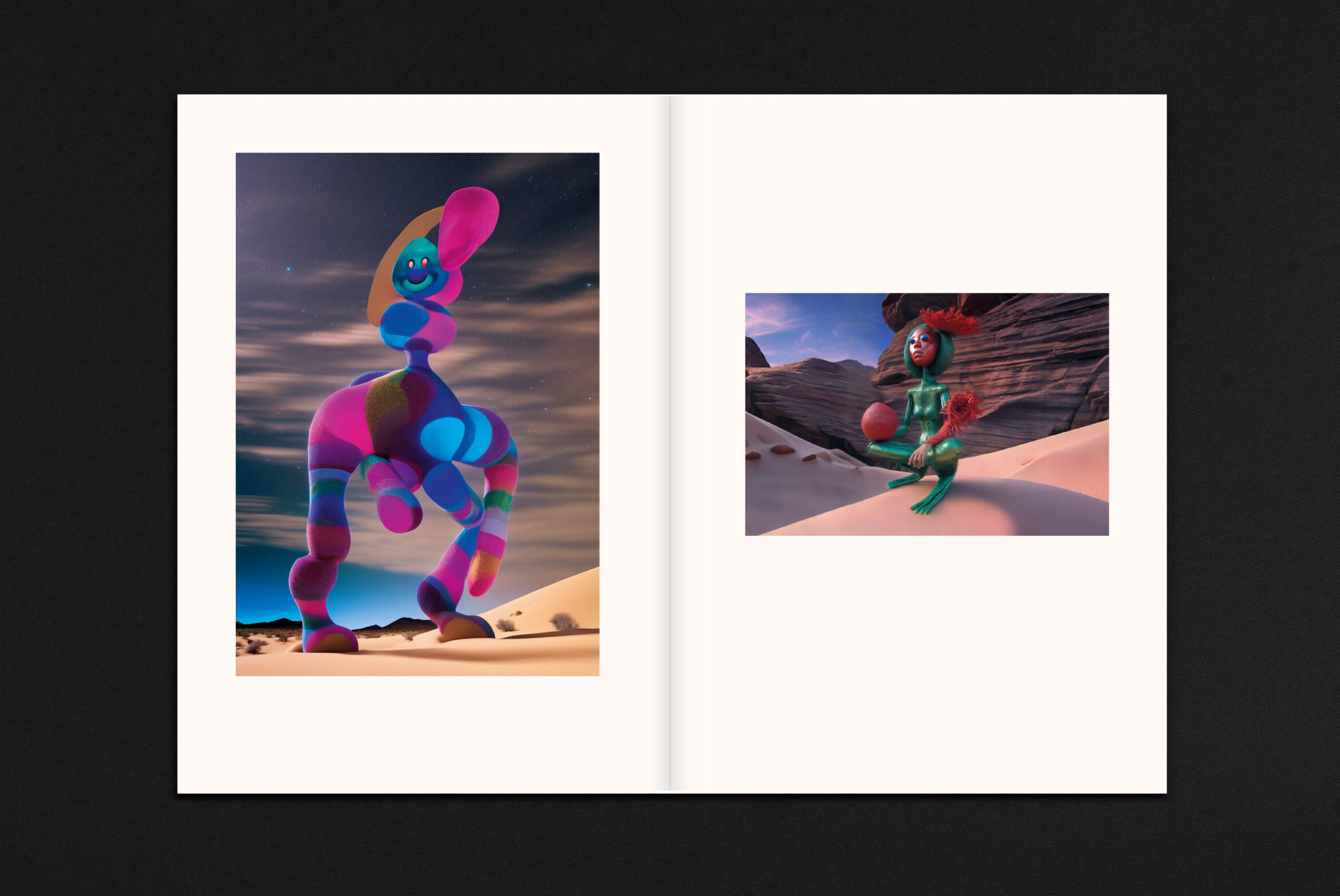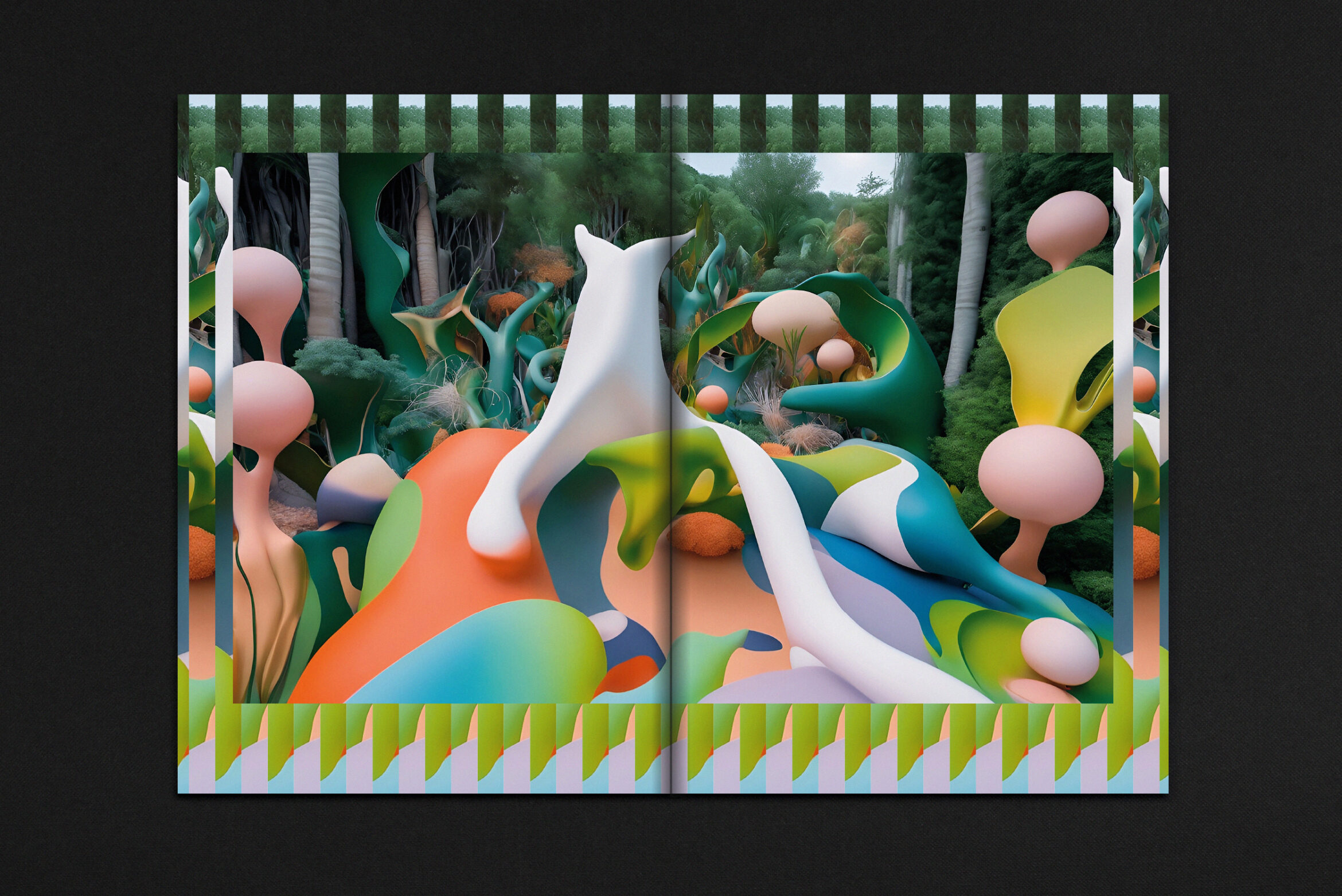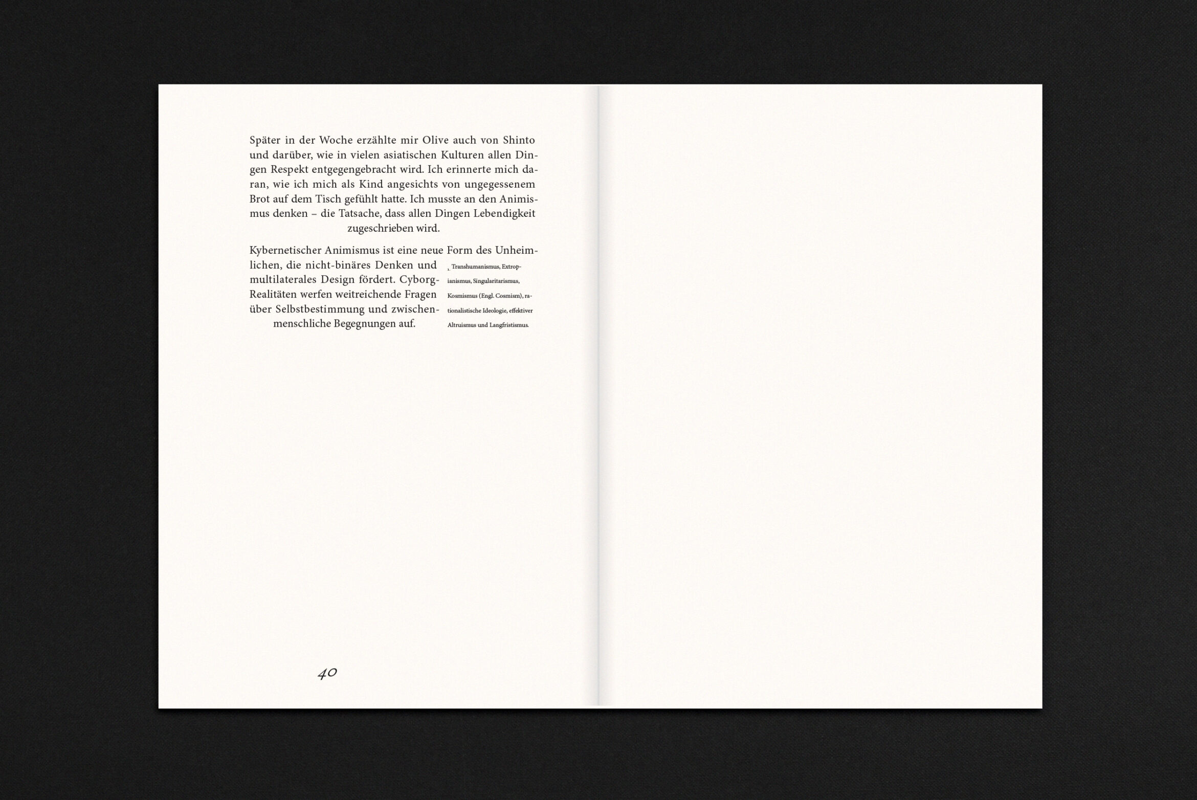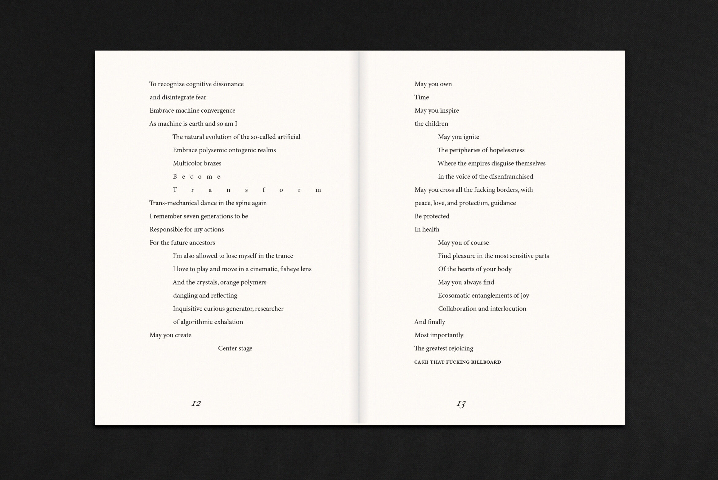 In the resonance space of the exhibition »Hyper Creatures«, a publication in edition form was created in conceptual collaboration with curators Patrick Blümel, Sophia Naumann, and the artist Kira Xonorika: »Spirit Verses« – a multi-layered, surreal artistic work of image and text, unfolding over 74 pages. »Through poetry, surrealist literature, speculation and autoethnography, it weaves together personal stories and ideas in dialogue with the current exhibition Hypercreatures: Future Mythologies. This bilingual limited edition is available in English and German at the Max Ernst Museum. The book features images produced through generative AI trained on my datasets, alongside collage and digital painting.«Kira Xonorika The verses move between calm, classical paragraphs and playful displacements – always harmonious, structured by a French page layout and a clear baseline grid. Kira’s images and texts are presented in a Swiss brochure with hardcover: the back title shimmers in foil stamping, while the front cover features a lenticular image embedded in the board. On the occasion of the 20th anniversary, the book is available from today, 04.09.2025, at the Max Ernst Museum of the LVR in Brühl