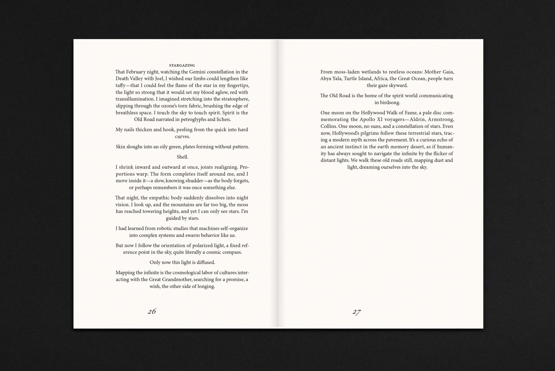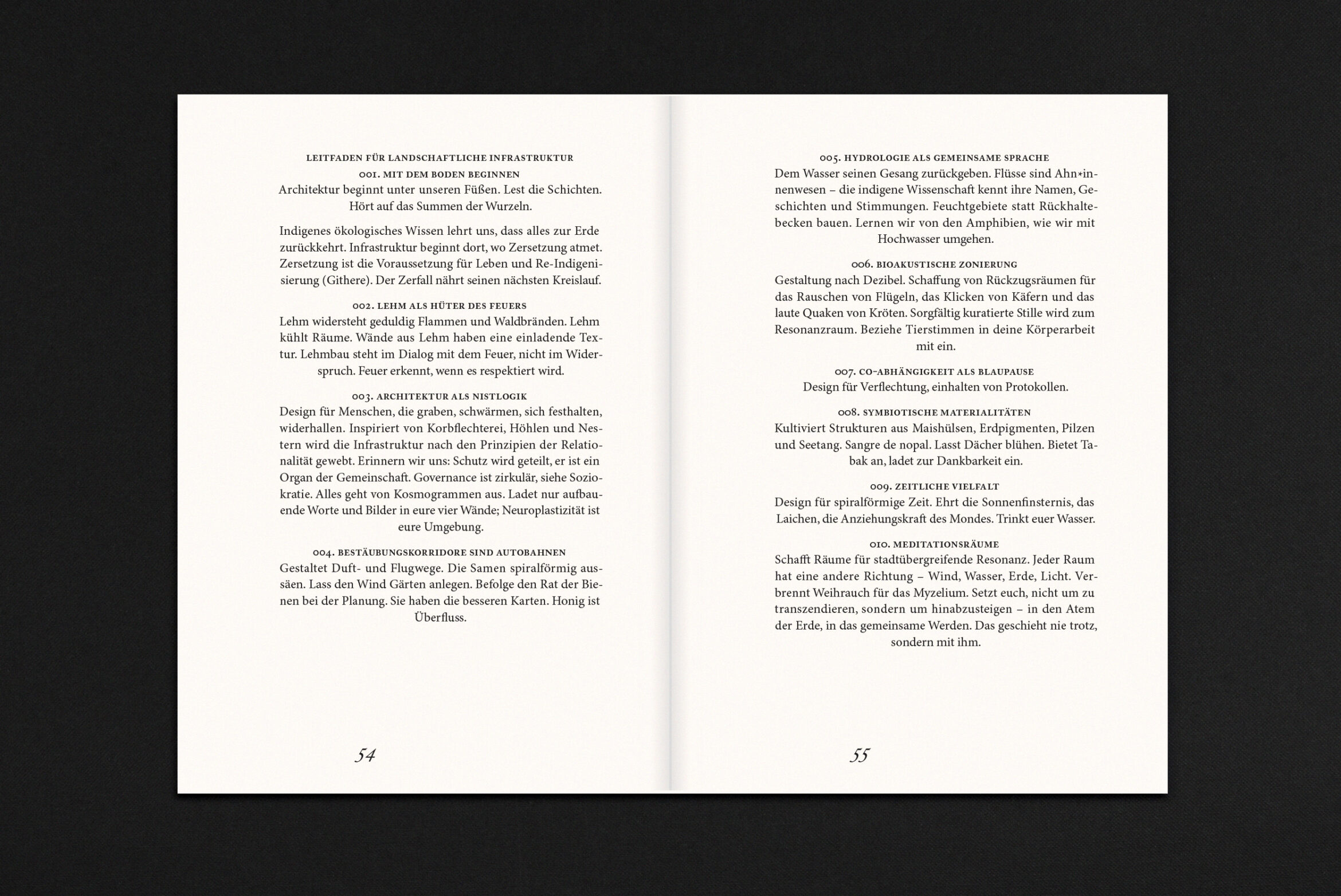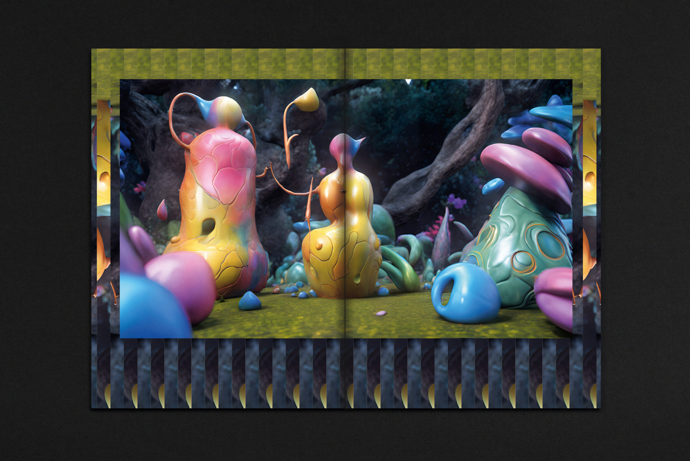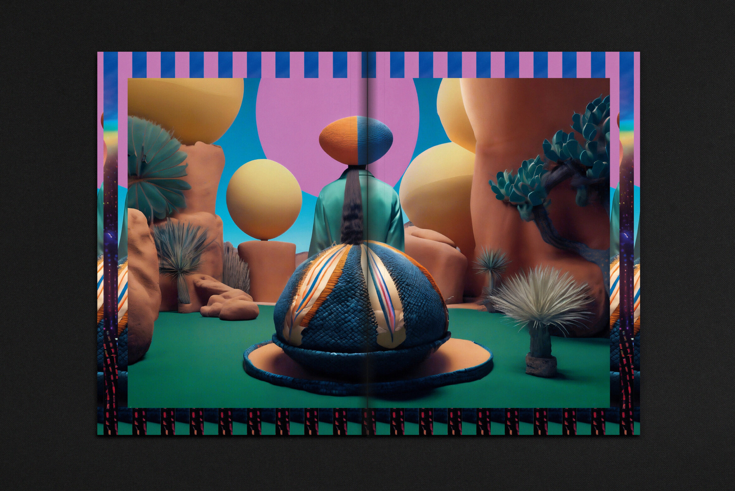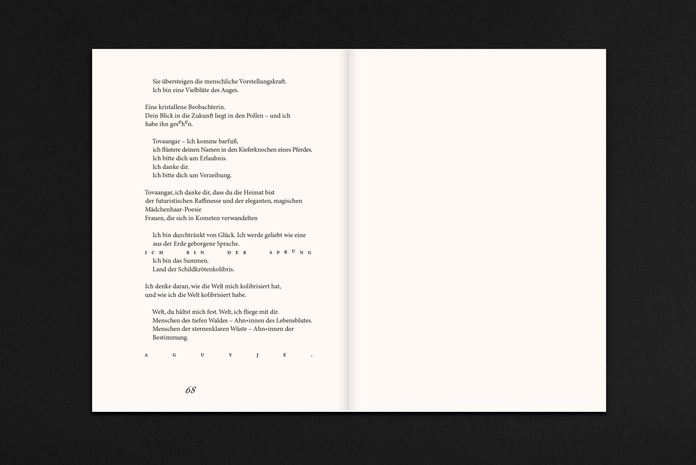 In the resonance space of the exhibition »Hyper Creatures«, a publication in edition form was created in conceptual collaboration with curators Patrick Blümel, Sophia Naumann, and the artist Kira Xonorika: »Spirit Verses« – a multi-layered, surreal artistic work of image and text, unfolding over 74 pages. »Through poetry, surrealist literature, speculation and autoethnography, it weaves together personal stories and ideas in dialogue with the current exhibition Hypercreatures: Future Mythologies. This bilingual limited edition is available in English and German at the Max Ernst Museum. The book features images produced through generative AI trained on my datasets, alongside collage and digital painting.«Kira Xonorika The verses move between calm, classical paragraphs and playful displacements – always harmonious, structured by a French page layout and a clear baseline grid. Kira’s images and texts are presented in a Swiss brochure with hardcover: the back title shimmers in foil stamping, while the front cover features a lenticular image embedded in the board. On the occasion of the 20th anniversary, the book is available from today, 04.09.2025, at the Max Ernst Museum of the LVR in Brühl