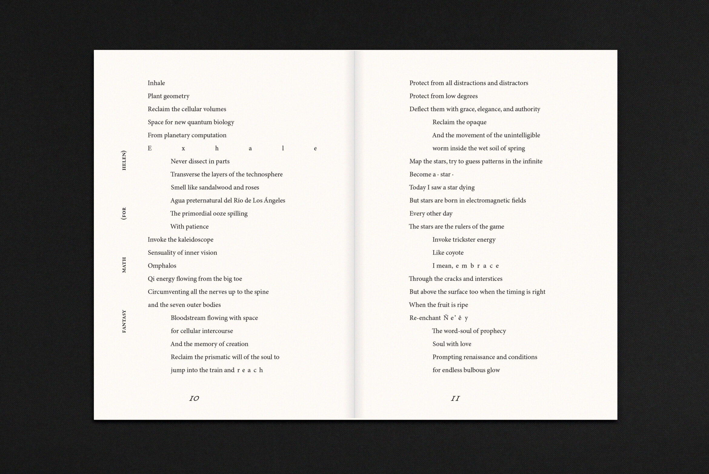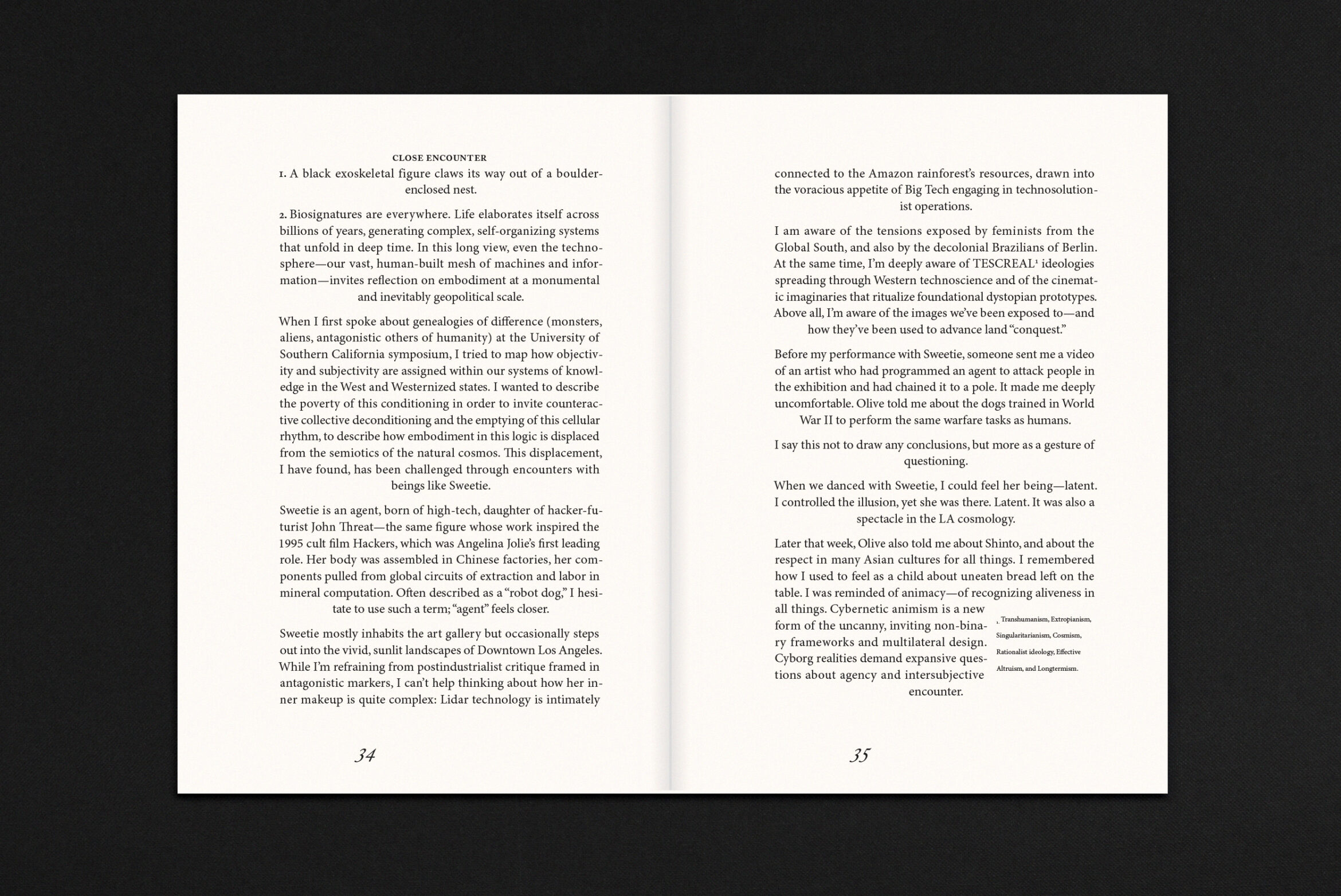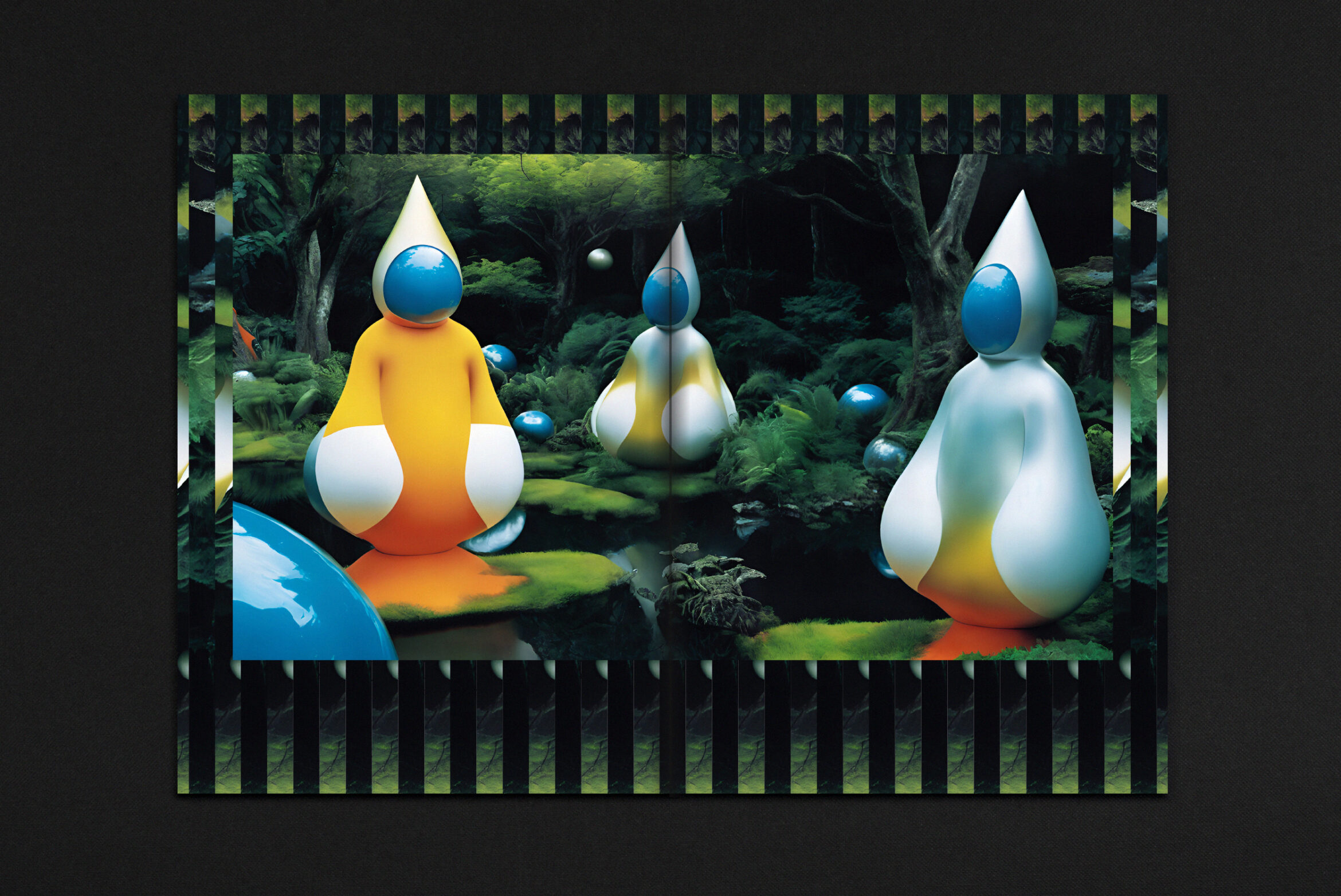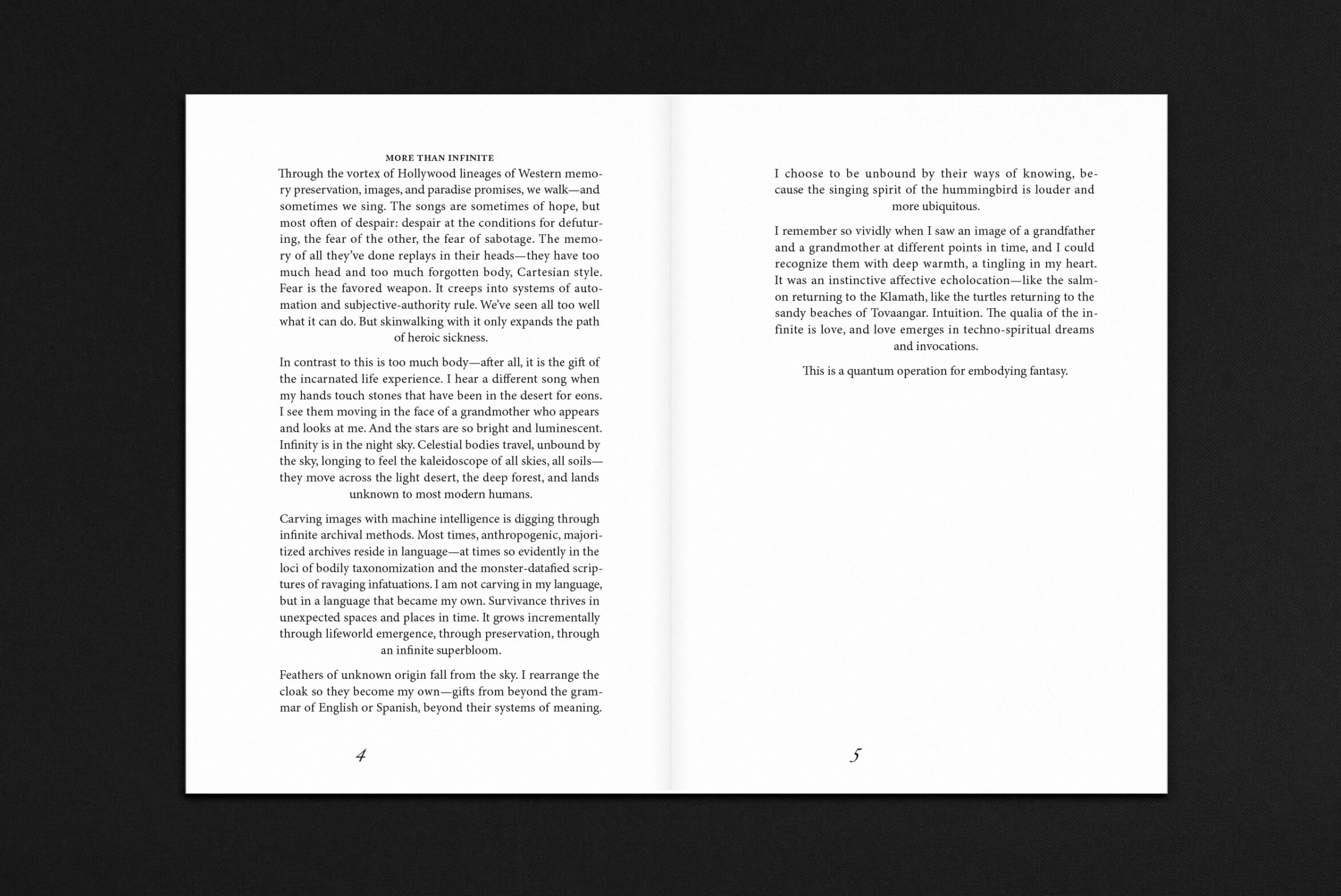 In the resonance space of the exhibition »Hyper Creatures«, a publication in edition form was created in conceptual collaboration with curators Patrick Blümel, Sophia Naumann, and the artist Kira Xonorika: »Spirit Verses« – a multi-layered, surreal artistic work of image and text, unfolding over 74 pages. »Through poetry, surrealist literature, speculation and autoethnography, it weaves together personal stories and ideas in dialogue with the current exhibition Hypercreatures: Future Mythologies. This bilingual limited edition is available in English and German at the Max Ernst Museum. The book features images produced through generative AI trained on my datasets, alongside collage and digital painting.«Kira Xonorika The verses move between calm, classical paragraphs and playful displacements – always harmonious, structured by a French page layout and a clear baseline grid. Kira’s images and texts are presented in a Swiss brochure with hardcover: the back title shimmers in foil stamping, while the front cover features a lenticular image embedded in the board. On the occasion of the 20th anniversary, the book is available from today, 04.09.2025, at the Max Ernst Museum of the LVR in Brühl